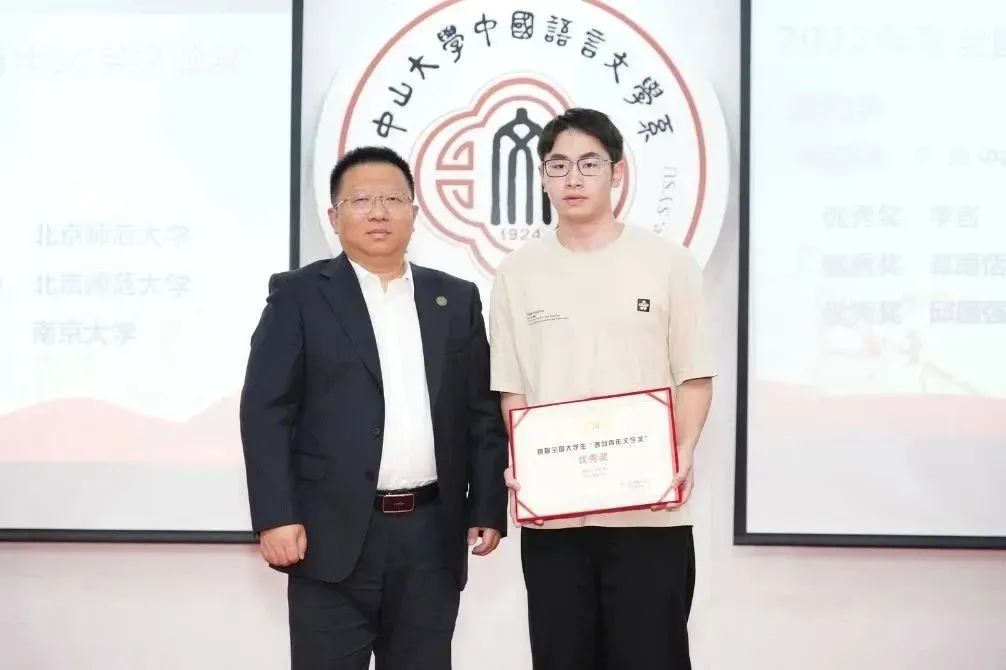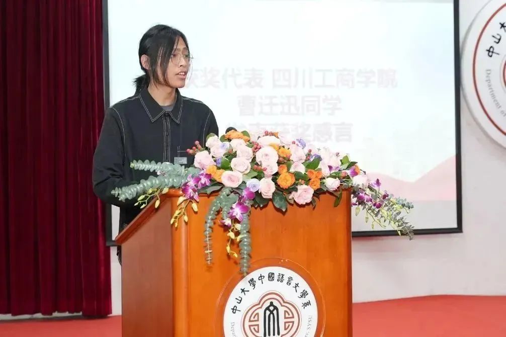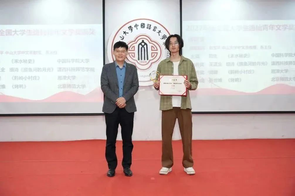 随后,颁发了2023年度全国大学生逸仙青年文学奖。西渡教授、世宾副主任为诗歌奖领奖人曹迁迅、周楷棋、王井颁奖,来自四川工商学院的曹迁迅同学作为获奖代表发表了感言,曹同学在感言中感慨:“这并不是一个会埋没作品的时代。”