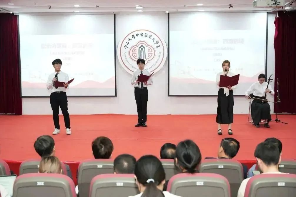 在典礼中,本系的陈荣、钟立恒、陈韵如、李佳桦、顾逸同学为全场观众带来了精彩的配乐诗朗诵。西渡教授的诗作《如果你不懂大海的蔚蓝》、《鸥鹭》、《火》在同学们情感充沛的朗诵中迸发出别样的感染力,在二胡的悠悠声和同学们全情投入的朗诵中,诗歌的魅力、文学的魅力深深打动了在场的所有人。