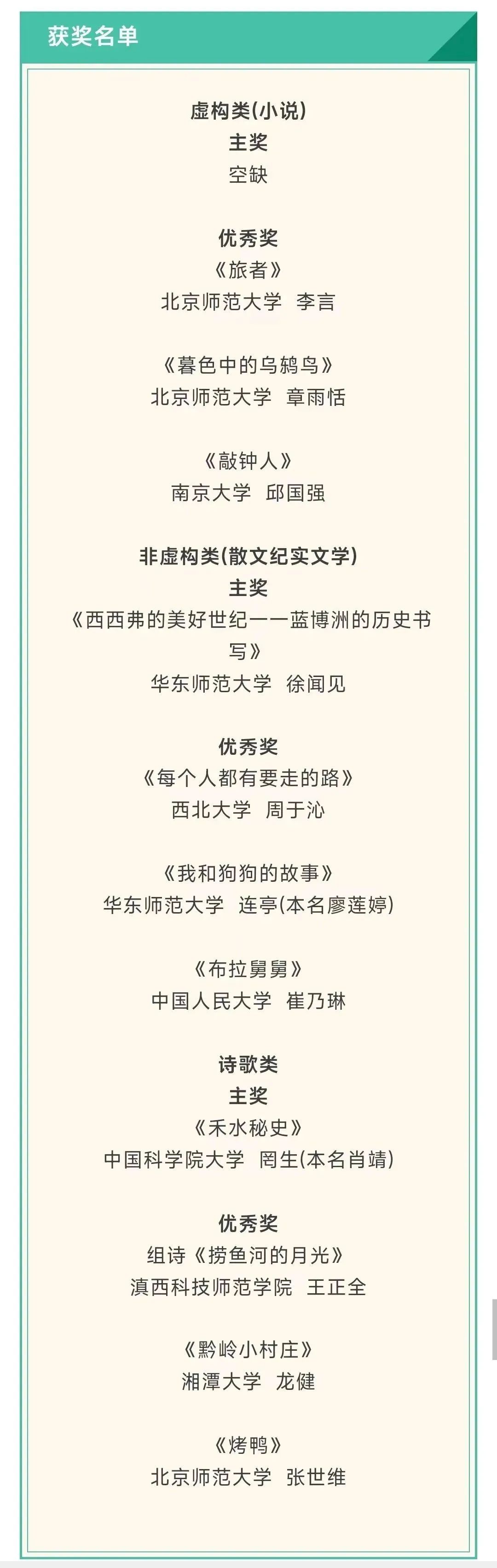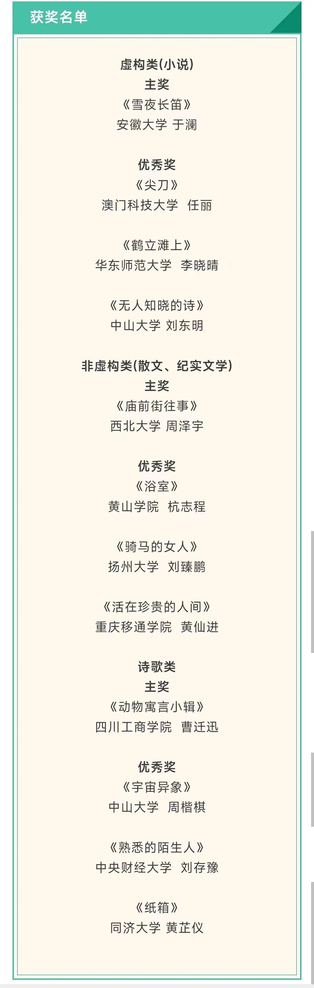 难忘华东师范大学的徐闻见学姐,在充斥着欢歌喧闹的夜晚坚持完成作品初稿,用对文学的坚守对抗外界的喧嚣,终于换来今日的佳作。