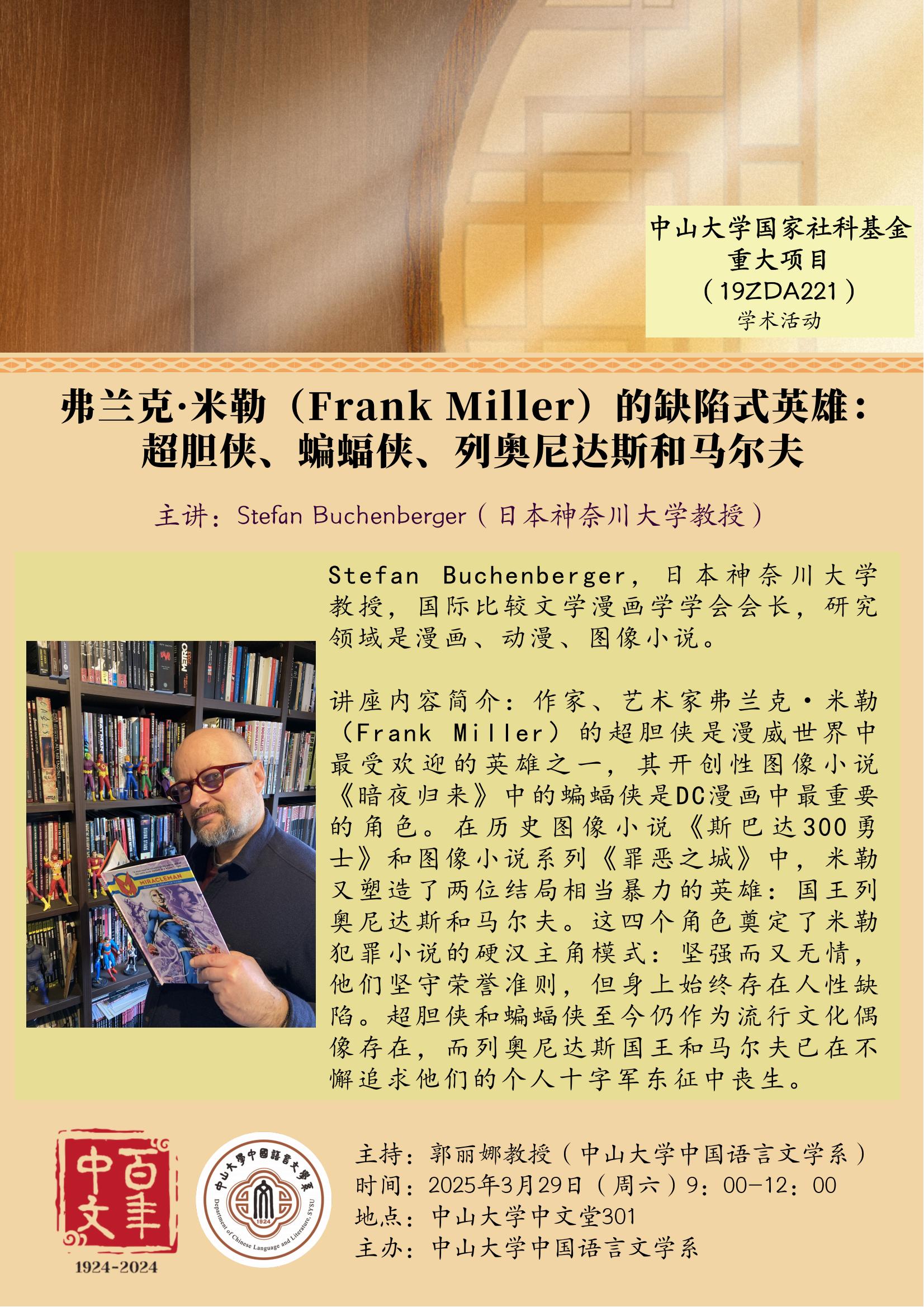 导航痕迹 中山大学中国语言文学系 动态新闻 讲座预告 讲座预告 | 弗兰克·米勒(Frank Miller)的缺陷式英雄:超胆侠、蝙蝠侠、列奥尼达斯和马尔夫 扫描此二维码分享 讲座预告 | 弗兰克·米勒(Frank Miller)的缺陷式英雄:超胆侠、蝙蝠侠、列奥尼达斯和马尔夫 发布人:jiangrt 发布日期:2025-03-26 活动时间 2025年03月29日 09:00 - 2025年03月29日 12:00
